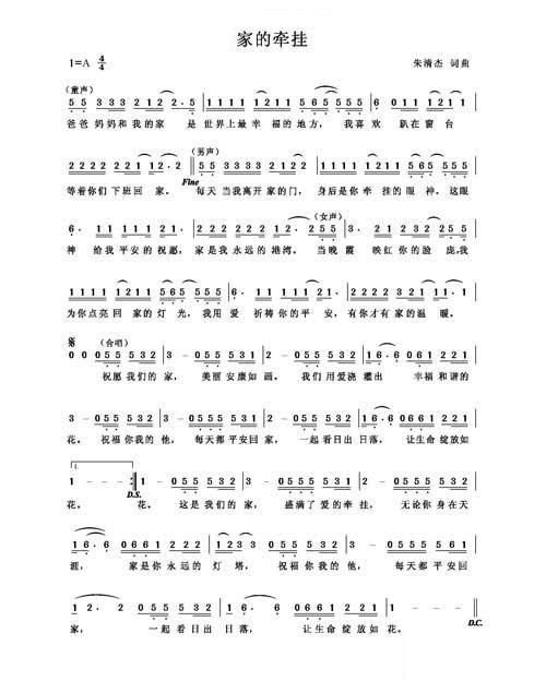 朱清杰/王诗雨/闫梓昱演唱的家的牵挂歌词,家的牵挂简谱.