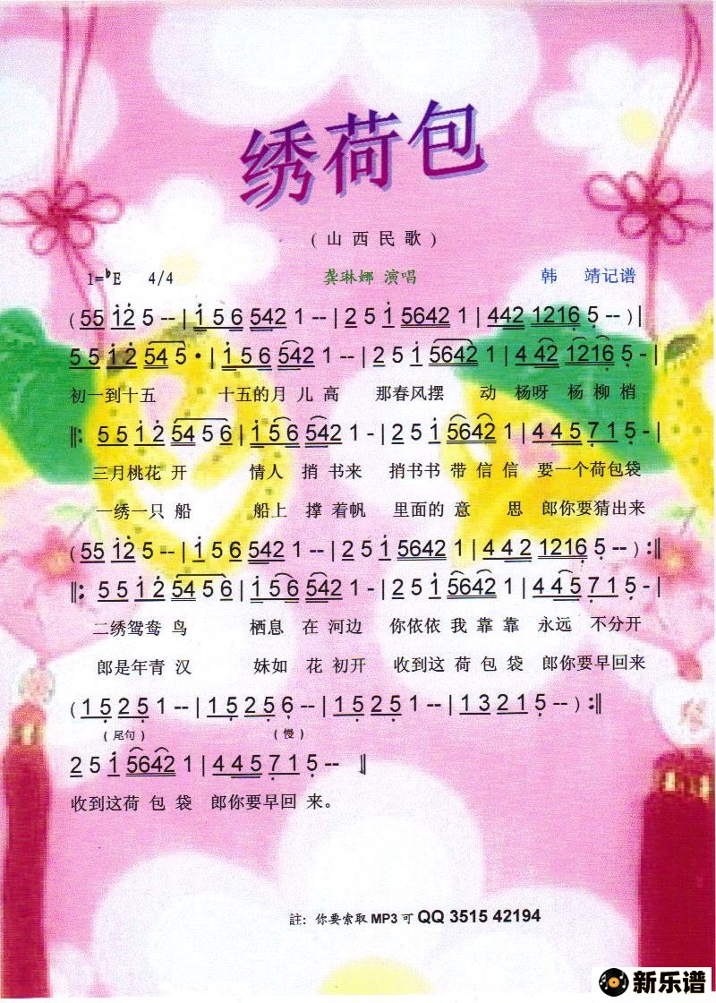 龚琳娜演唱的绣荷包(山西民歌)【彩谱】歌词,绣荷包(山西民歌)【彩谱】简谱.