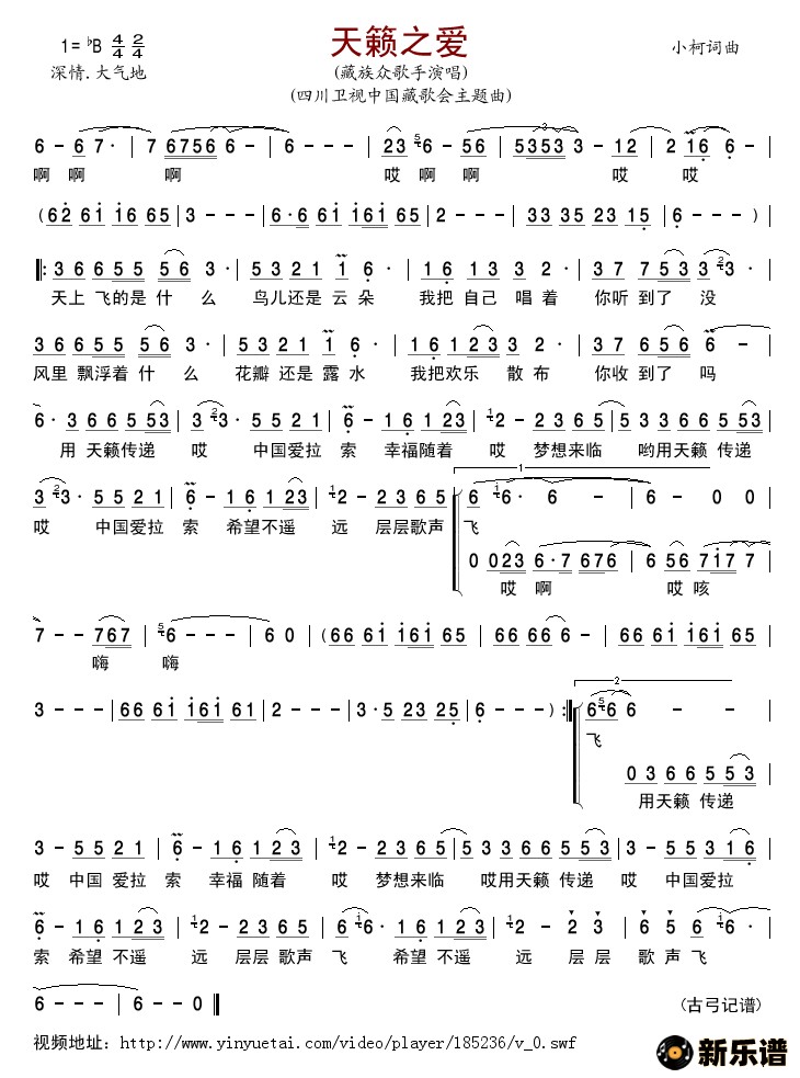 藏族众歌手演唱的天籁之爱歌词,天籁之爱简谱.