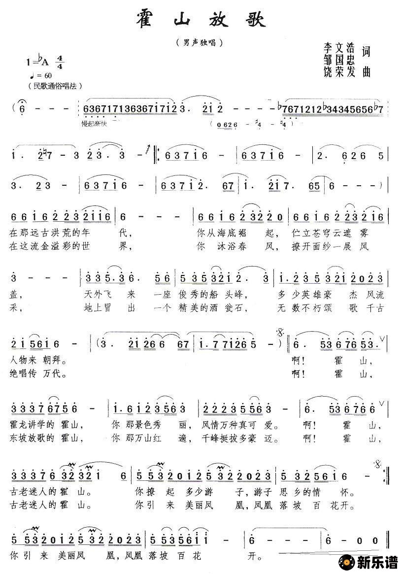 演唱的霍山放歌歌词,霍山放歌简谱.