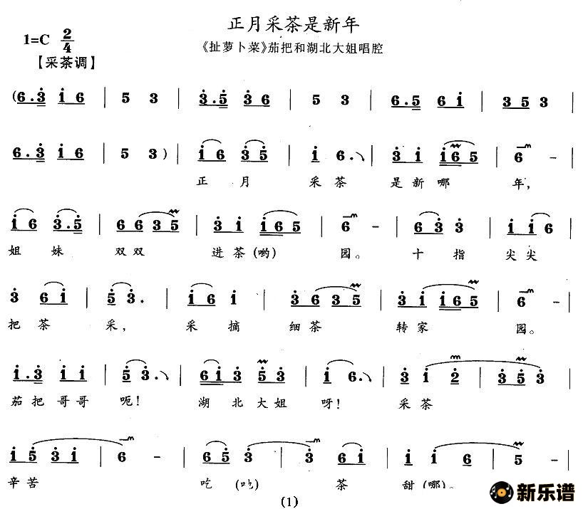 演唱的正月采茶是新年(《扯萝卜菜》茄把和湖北大姐唱段)歌词,正月采茶是新年(《扯萝卜菜》茄把和湖北大姐唱段)简谱.