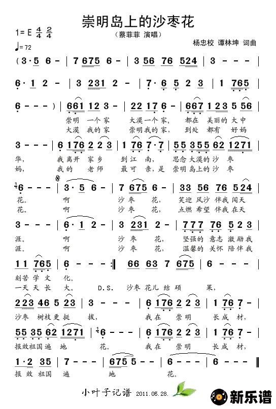 《崇明岛上的沙枣花》简谱 蔡菲菲-小叶子制谱