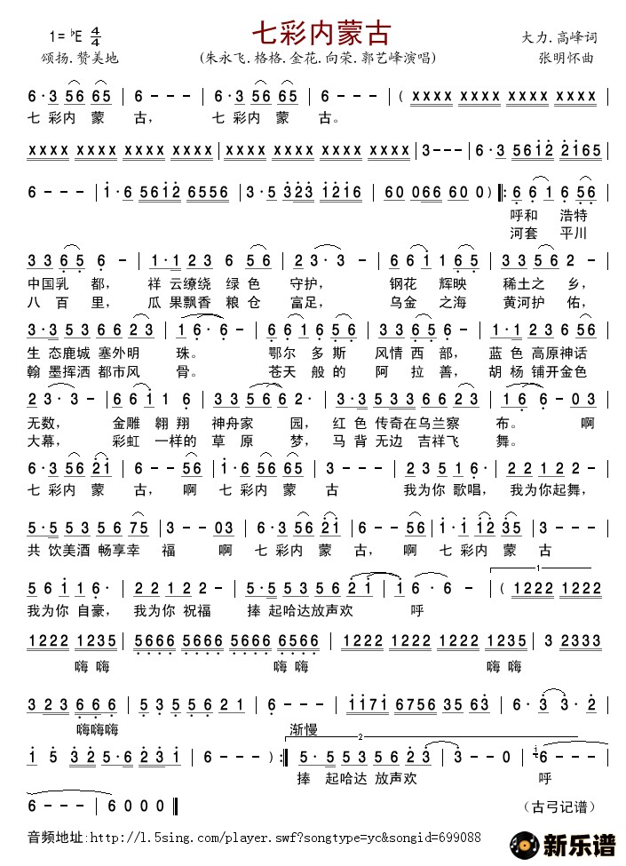 朱永飞 格格 金花 向荣 郭艺峰演唱的七彩内蒙古歌词,七彩内蒙古简谱.