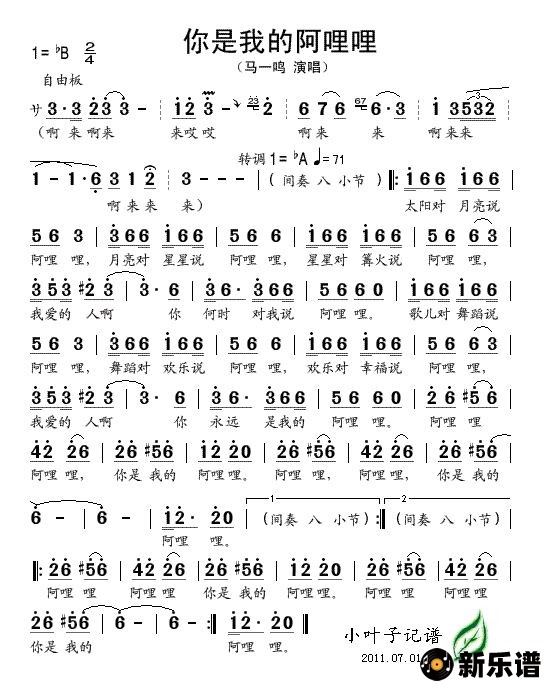 《你是我的阿哩哩》简谱 马一鸣-小叶子制谱