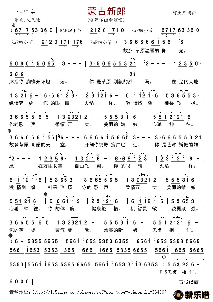 哈萨尔组合演唱的蒙古新郎歌词,蒙古新郎简谱.