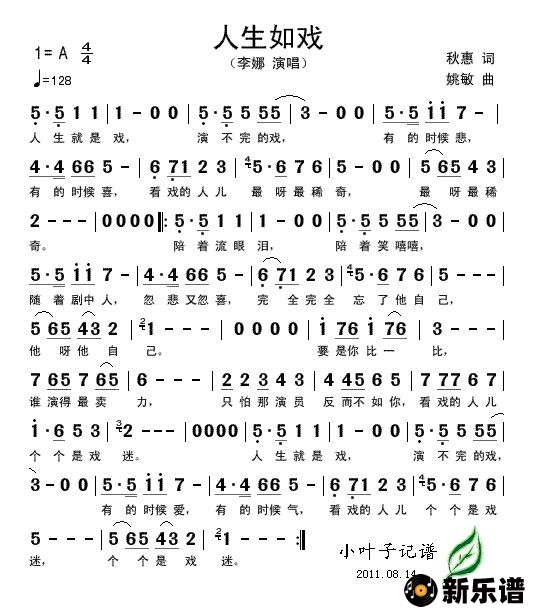 《人生如戏》简谱 李娜-小叶子制谱