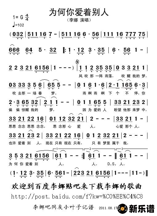 李娜演唱的为何你爱着别人歌词,为何你爱着别人简谱.