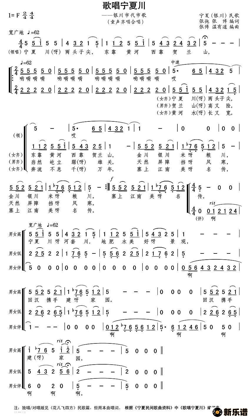 演唱的歌唱宁夏川(张弛词曲、童声合唱)歌词,歌唱宁夏川(张弛词曲、童声合唱)简谱.