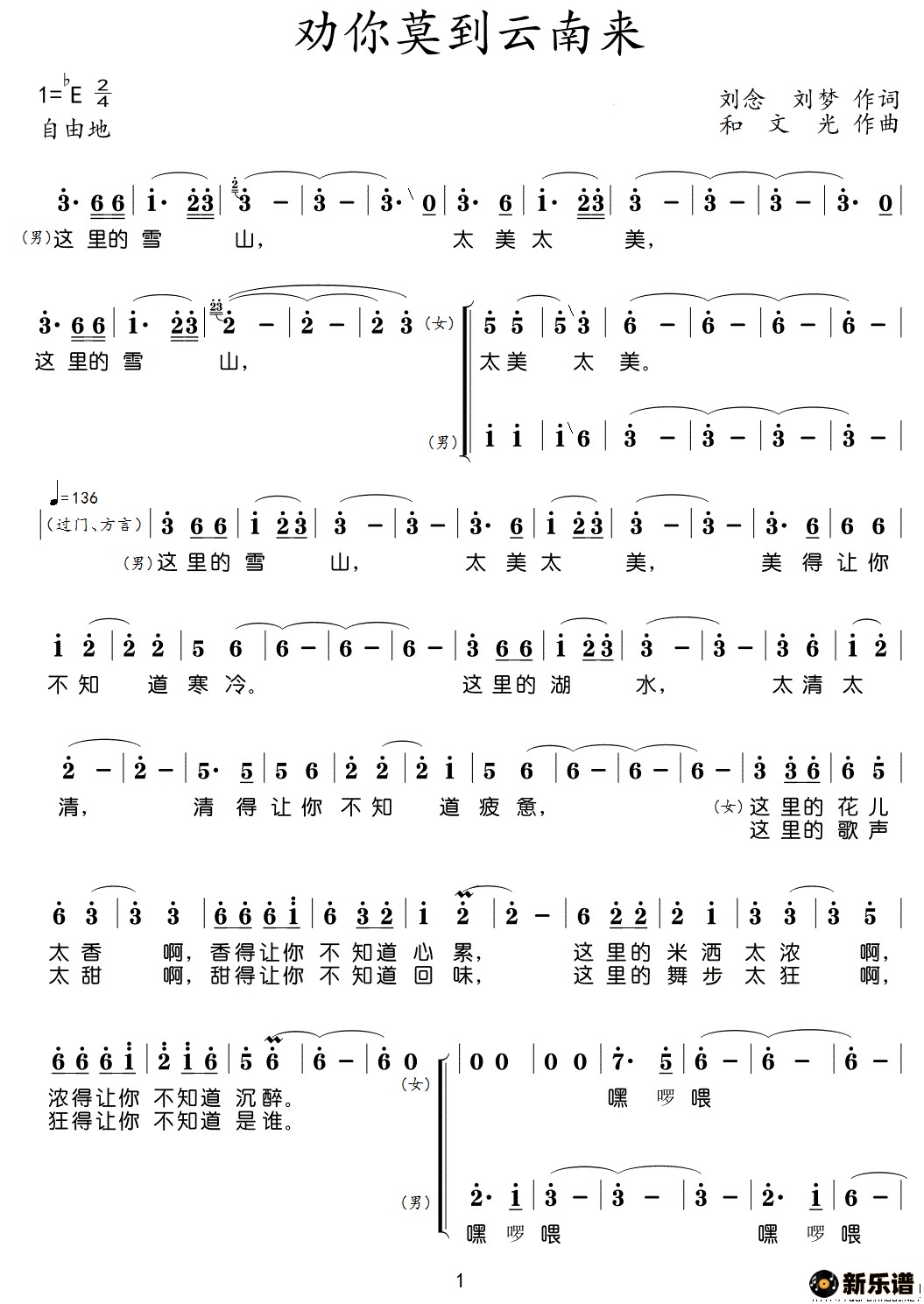 演唱的劝你莫到云南来(1)歌词,劝你莫到云南来(1)简谱.