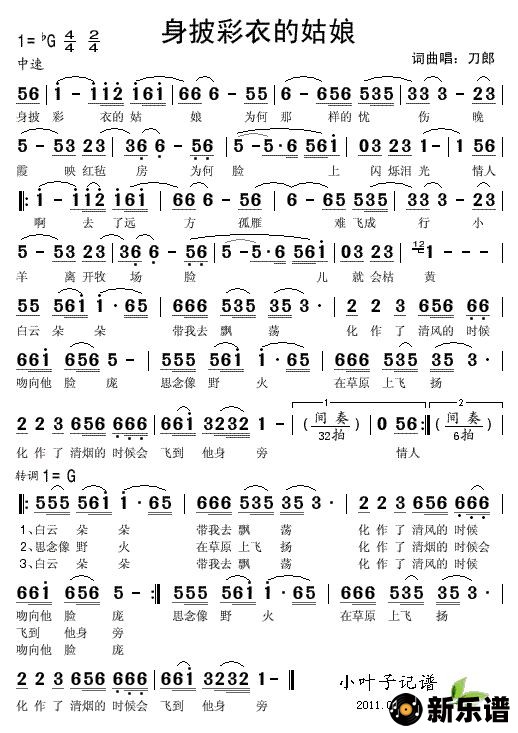 《身披彩衣的姑娘》简谱 刀郎-小叶子制谱