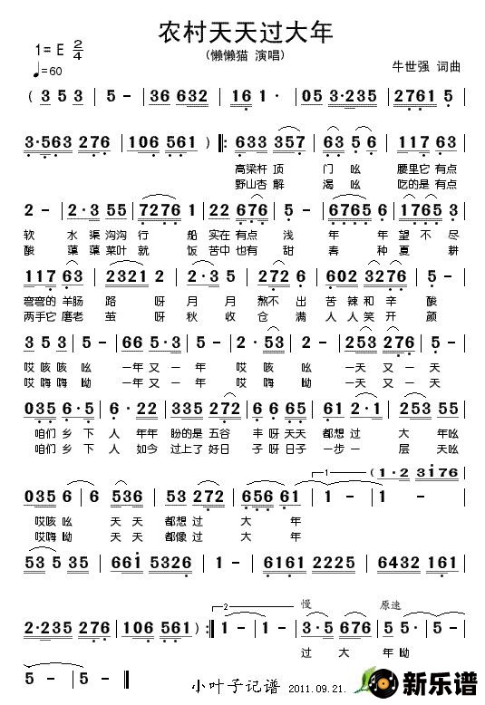 懒懒猫演唱的农村天天过大年歌词,农村天天过大年简谱.