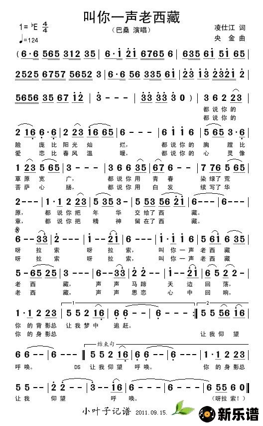 《叫你一声老西藏》简谱 巴桑-小叶子制谱