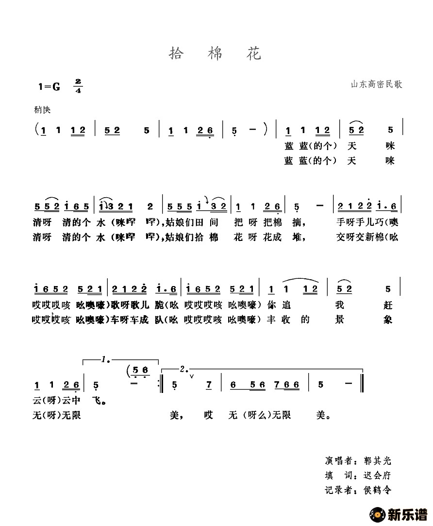 韦有琴演唱的拾棉花(山东高密民歌)歌词,拾棉花(山东高密民歌)简谱.