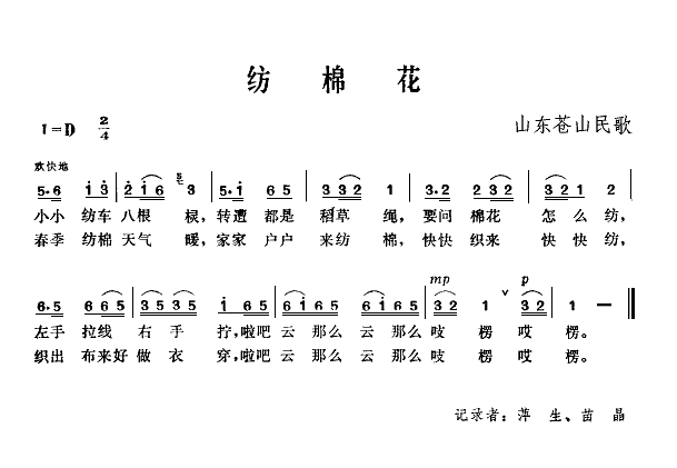 韦有琴演唱的纺棉花(山东苍山民歌)歌词,纺棉花(山东苍山民歌)简谱.