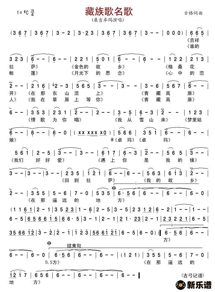藏族歌名歌/桑吉卓玛 相关曲谱