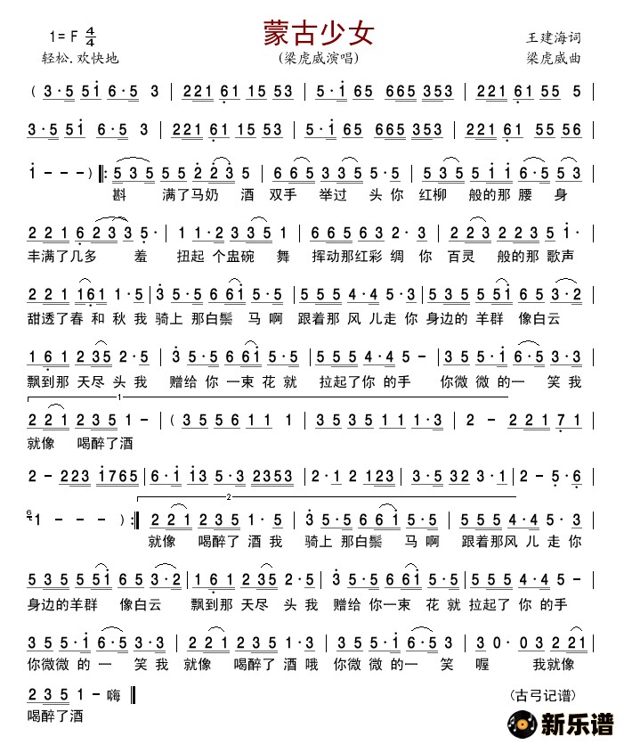 梁虎威演唱的蒙古少女歌词,蒙古少女简谱.