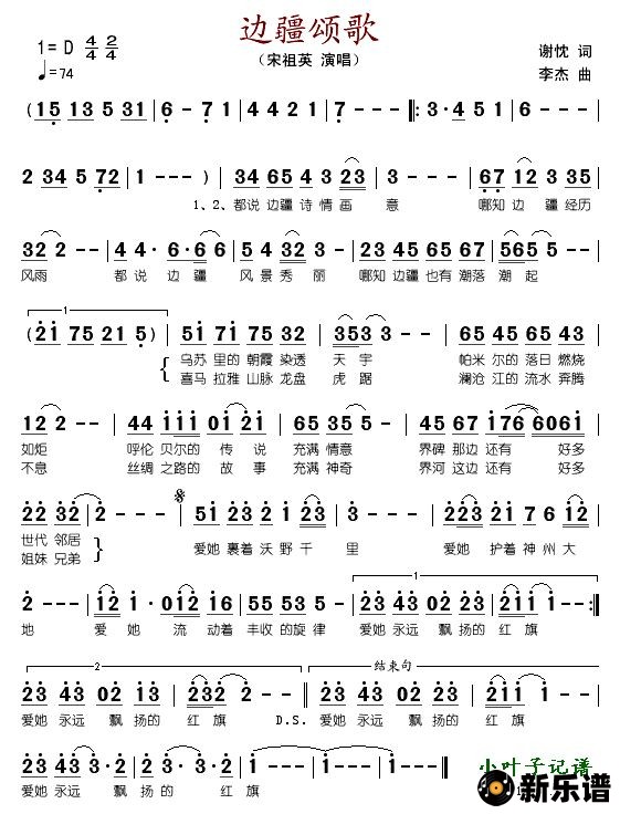 《边疆颂歌》简谱 宋祖英-小叶子制谱
