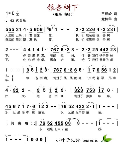 祖海演唱的银杏树下歌词,银杏树下简谱.