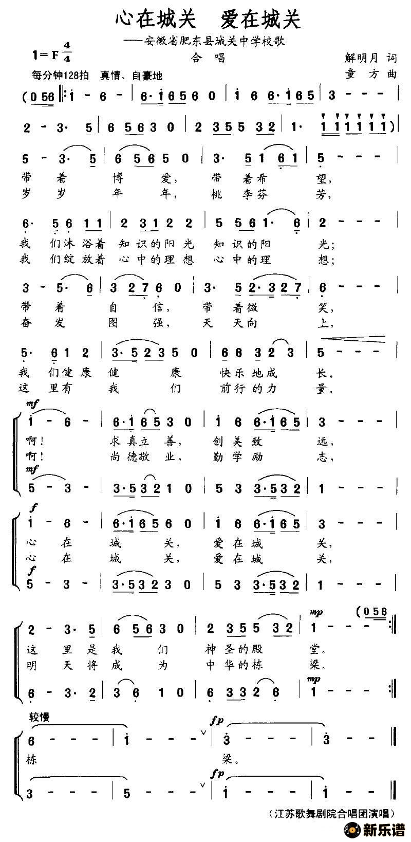 演唱的心在城关 爱在城关(安徽省肥东县城关中学校歌)歌词,心在城关 爱在城关(安徽省肥东县城关中学校歌)简谱.