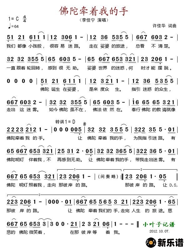《佛陀牵着我的手》简谱 李佳宁-小叶子制谱