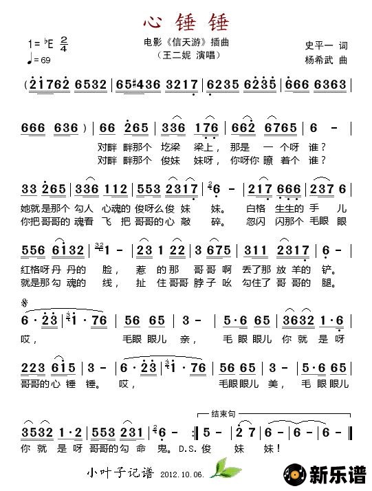 王二妮演唱的心锤锤歌词,心锤锤简谱.