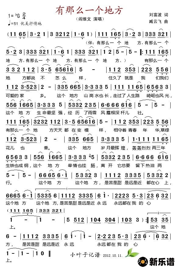 《有那么一个地方(阎维文)》简谱 阎维文-小叶子制谱