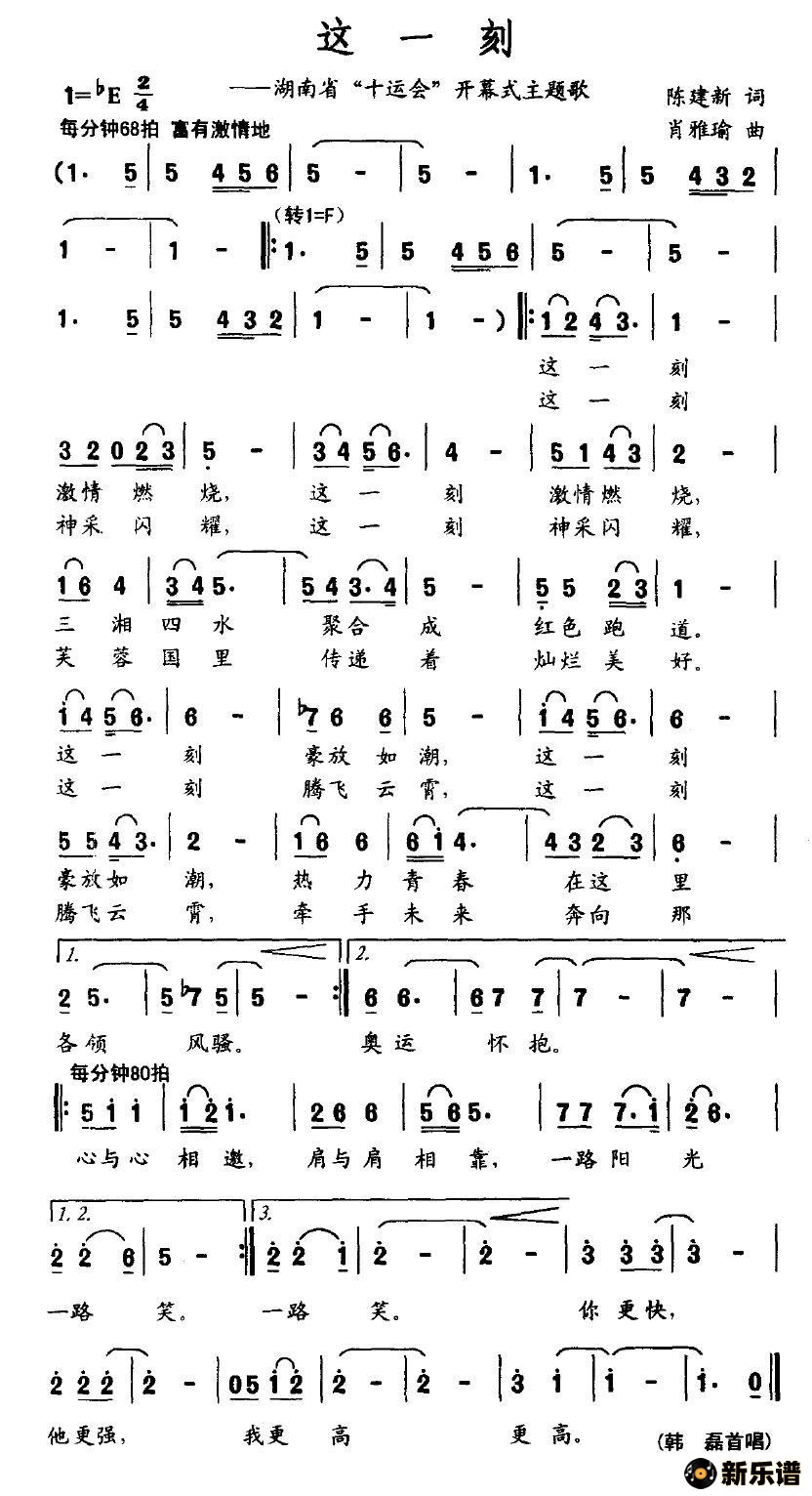 韩磊演唱的这一刻(湖南省“十运会”开幕式主题歌)歌词,这一刻(湖南省“十运会”开幕式主题歌)简谱.