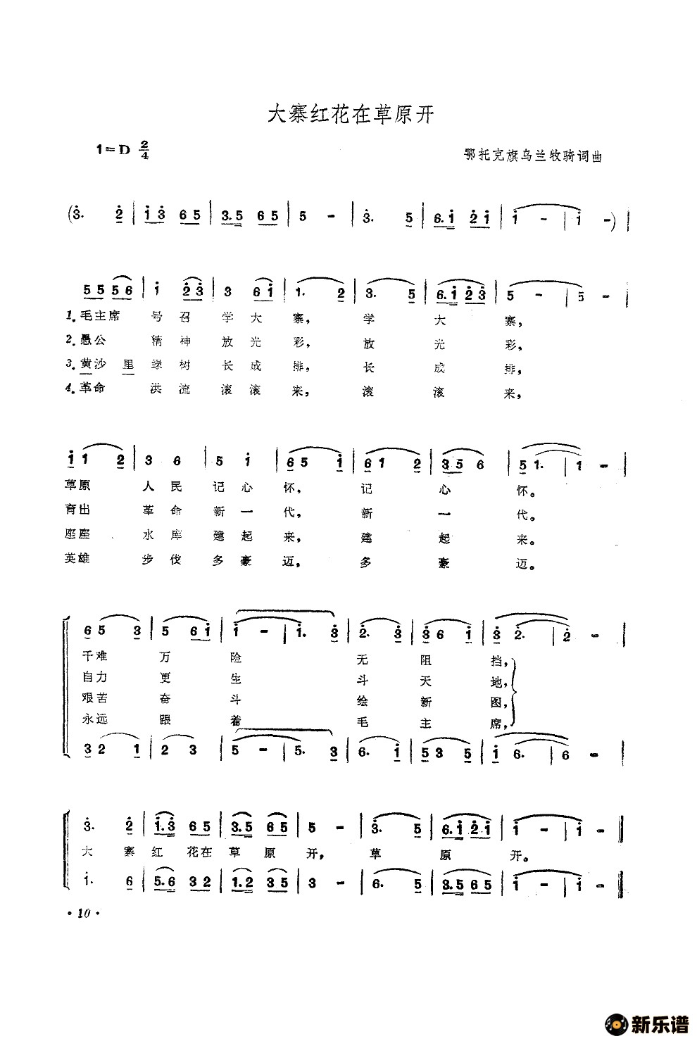 《大寨红花在草原开》简谱 内蒙古歌舞团