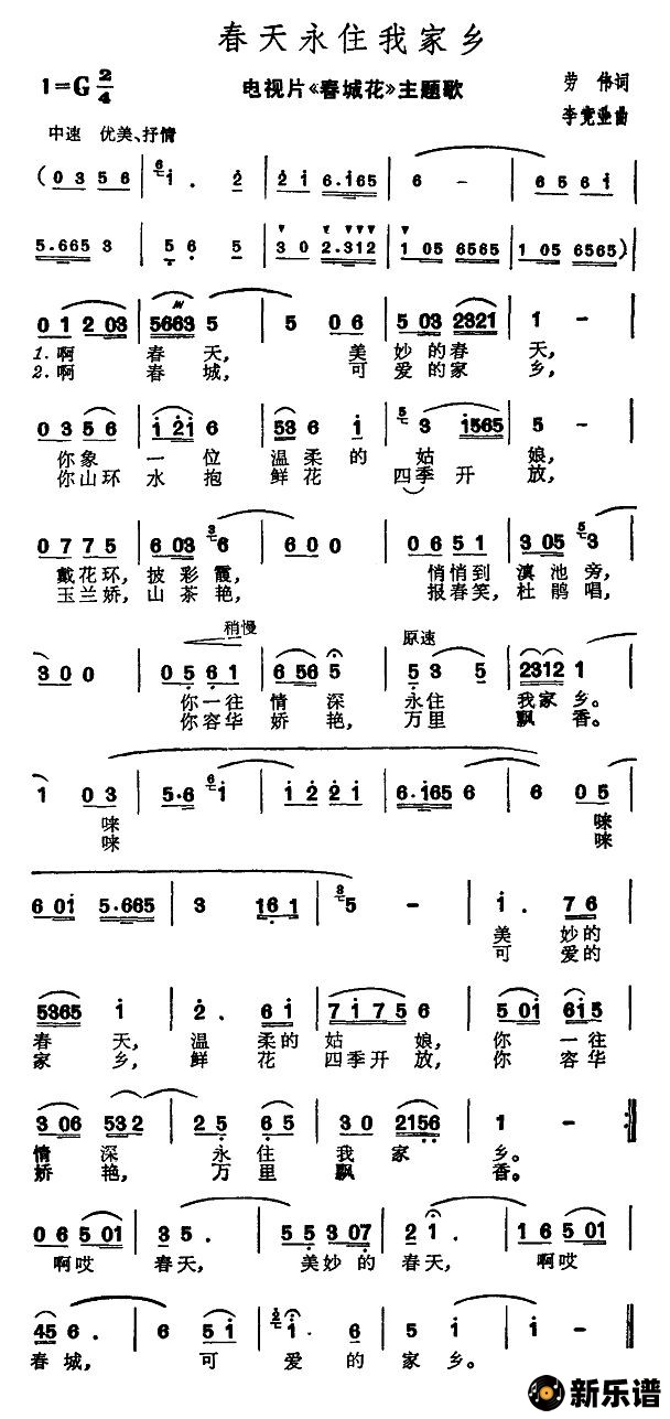 演唱的春天永住我家乡(电视片《春城花》主题歌)歌词,春天永住我家乡(电视片《春城花》主题歌)简谱.