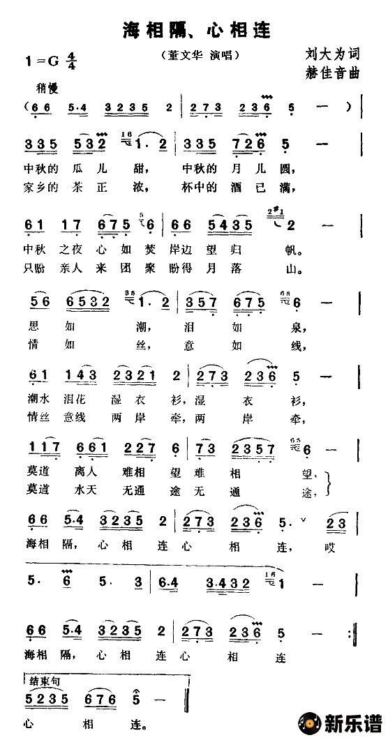 董文华演唱的海相隔、心想连歌词,海相隔、心想连简谱.