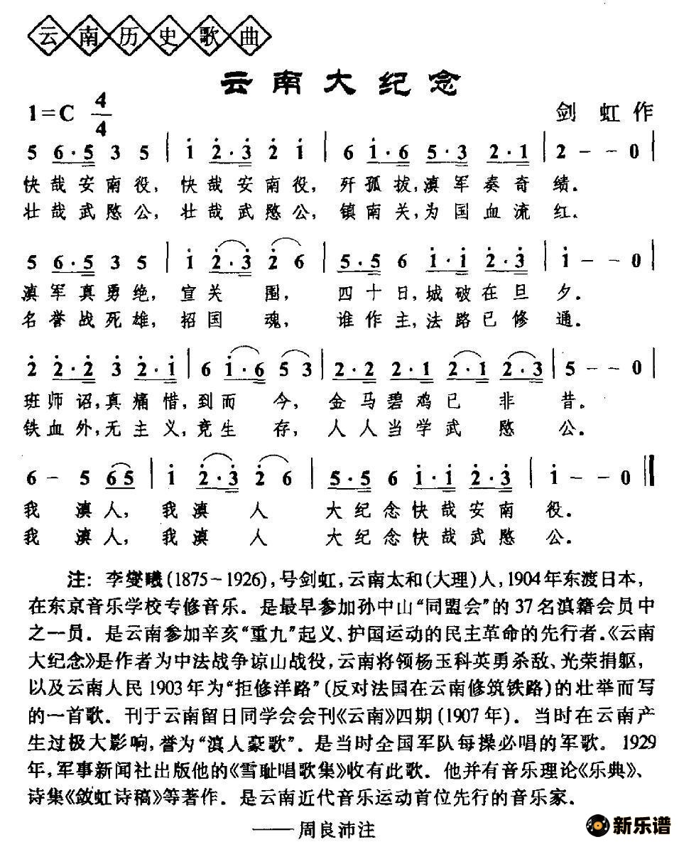 演唱的云南大纪念(云南历史歌曲)歌词,云南大纪念(云南历史歌曲)简谱.