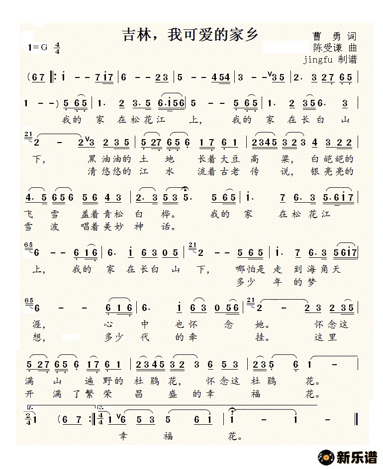 刘春梅演唱的吉林,我可爱的家乡歌词,吉林,我可爱的家乡简谱.