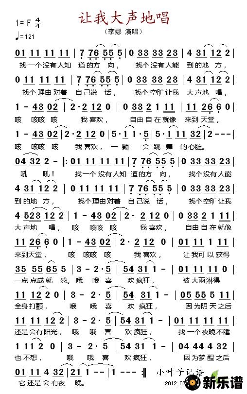 《让我大声地唱》简谱 李娜-小叶子制谱
