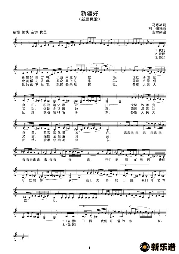 演唱的新疆好(线 谱)歌词,新疆好(线 谱)简谱.
