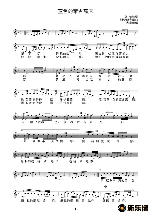 演唱的蓝色的蒙古高原(线 谱)歌词,蓝色的蒙古高原(线 谱)简谱.