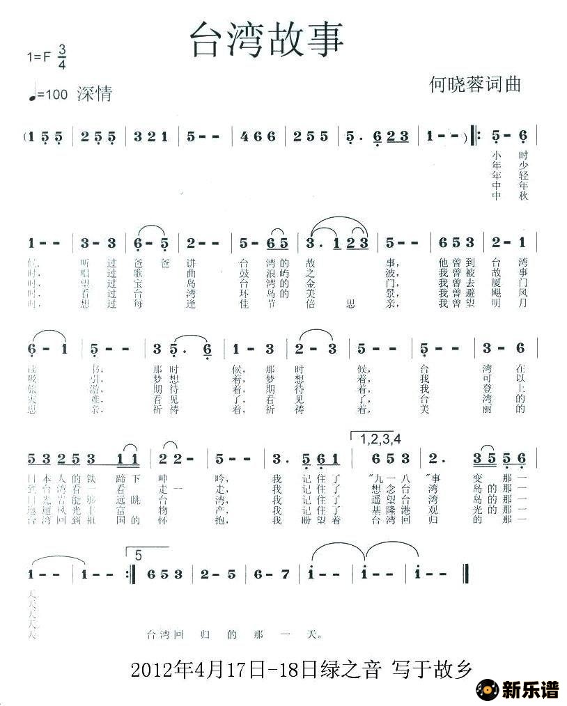 何晓蓉演唱的台湾故事歌词,台湾故事简谱.