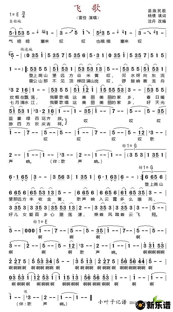 《飞歌(雷佳)》简谱 雷佳-小叶子制谱