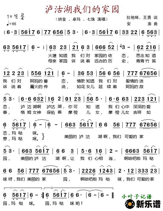 《泸沽湖我们的家园》简谱 纳金//卓玛//七珠-小叶子制谱