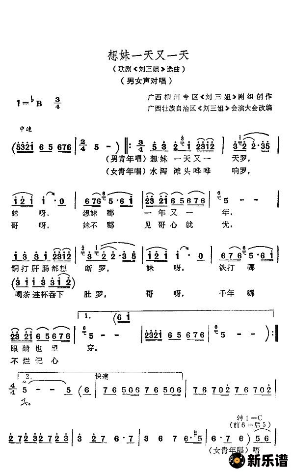 男女对唱演唱的想妹一天又一天歌词,想妹一天又一天简谱.