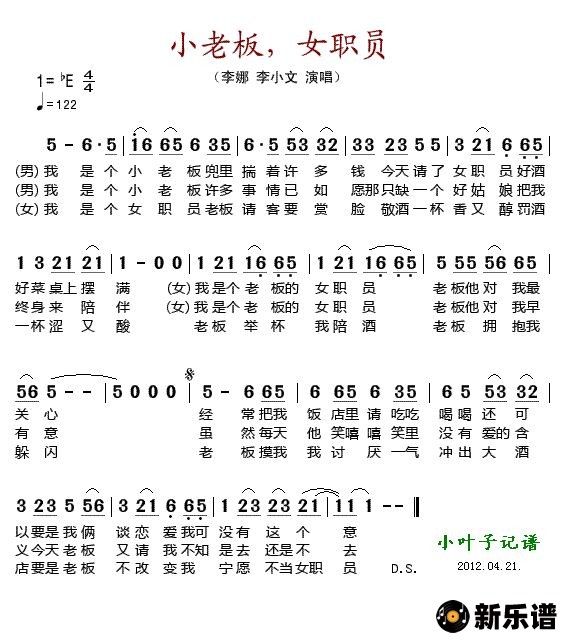 《小老板,女职员》简谱 李娜-小叶子制谱