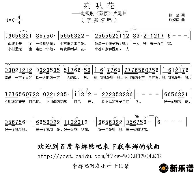 《喇叭花(电视剧《莽原》片尾曲)》简谱 李娜-小叶子制谱