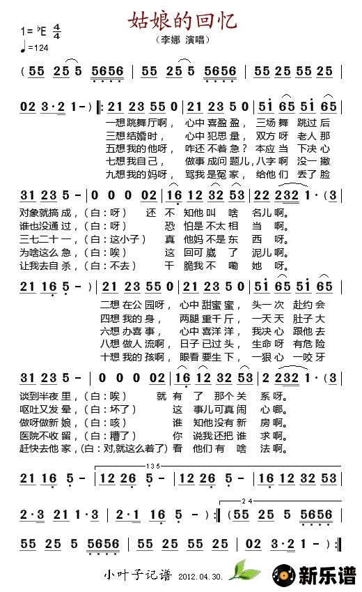 《姑娘的回忆》简谱 李娜-小叶子制谱
