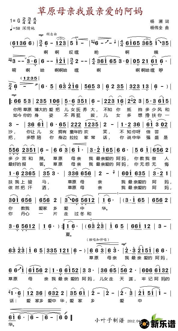 《草原母亲我最亲爱的阿妈》简谱 -小叶子制谱