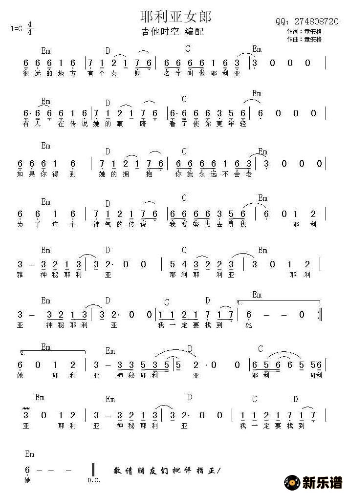 童安格演唱的耶利亚女郎(吉他时空编配)歌词,耶利亚女郎(吉他时空编配)简谱.