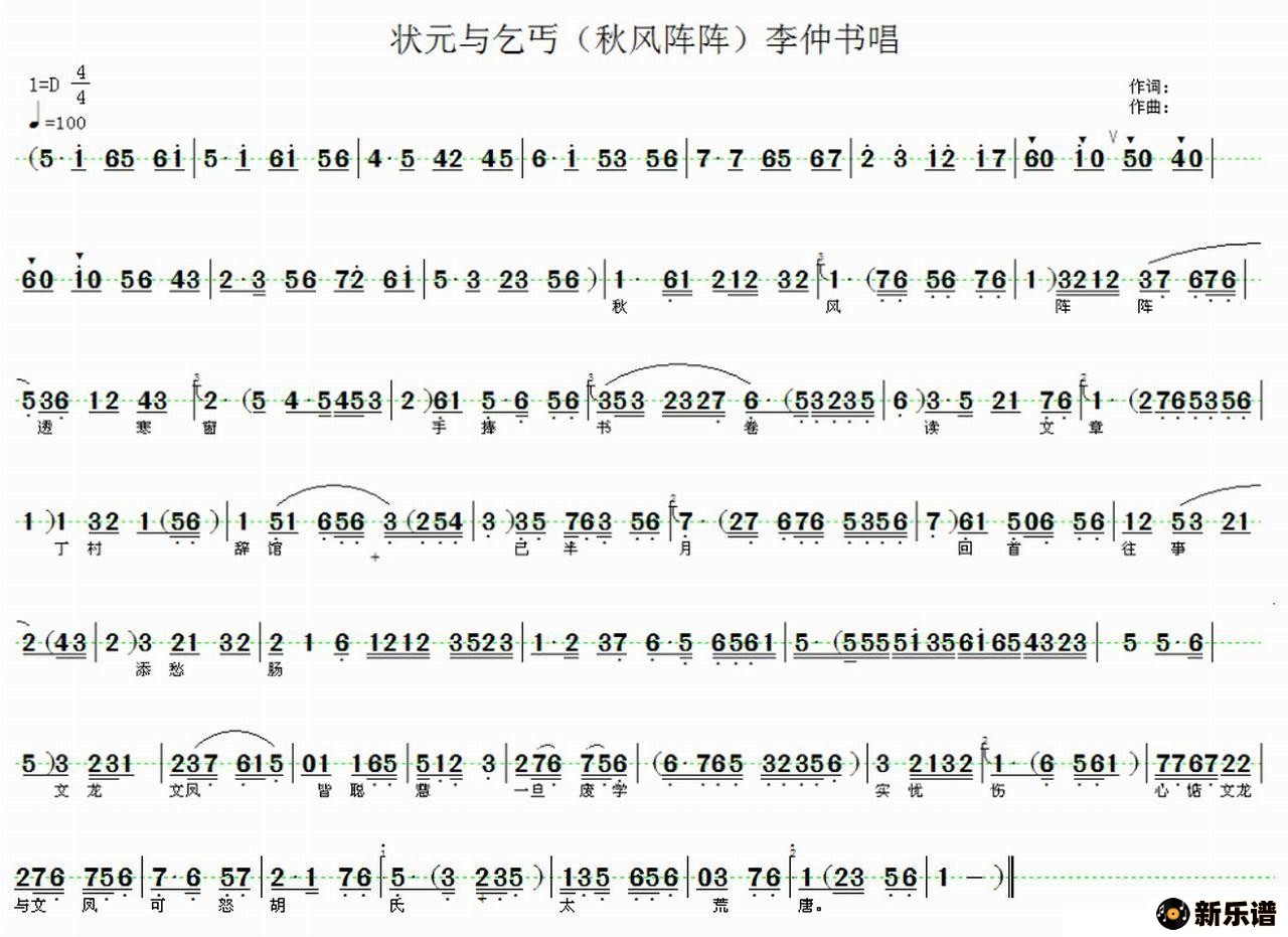 秋风阵阵透寒窗(《状元与乞丐》李仲书唱段)河北省、衡水市 评剧团 袁闯 河北省、衡水市 评剧团 袁闯演唱的秋风阵阵透寒窗(《状元与乞丐》李仲书唱段)歌词,秋风阵阵透寒窗(《状元与乞丐》李仲书唱段)简谱.