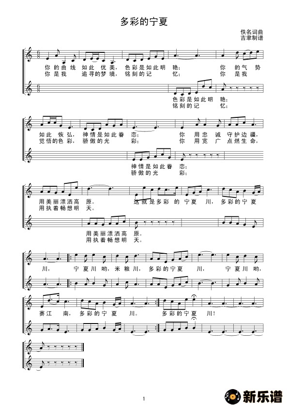 演唱的多彩的宁夏(线谱)歌词,多彩的宁夏(线谱)简谱.