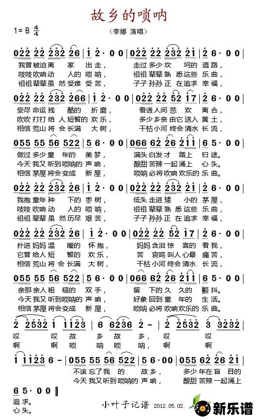 《故乡的唢呐》简谱 李娜-小叶子制谱