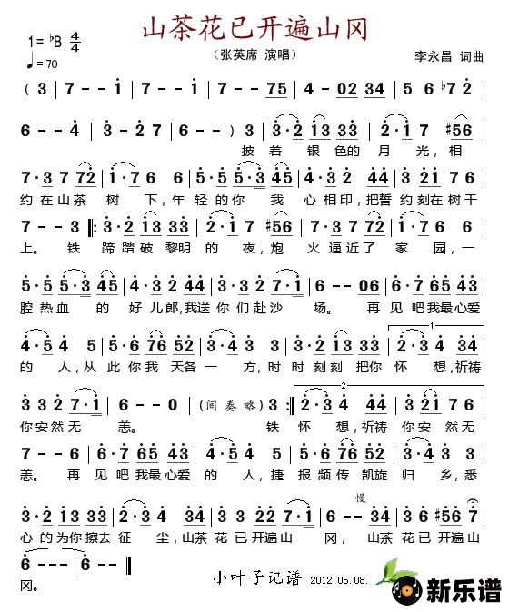 《山茶花已开遍山冈》简谱 张英席-小叶子制谱
