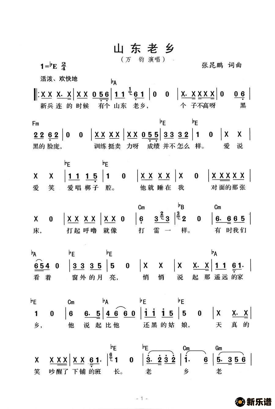 万钧演唱的山东老乡(张昆鹏词曲)歌词,山东老乡(张昆鹏词曲)简谱.