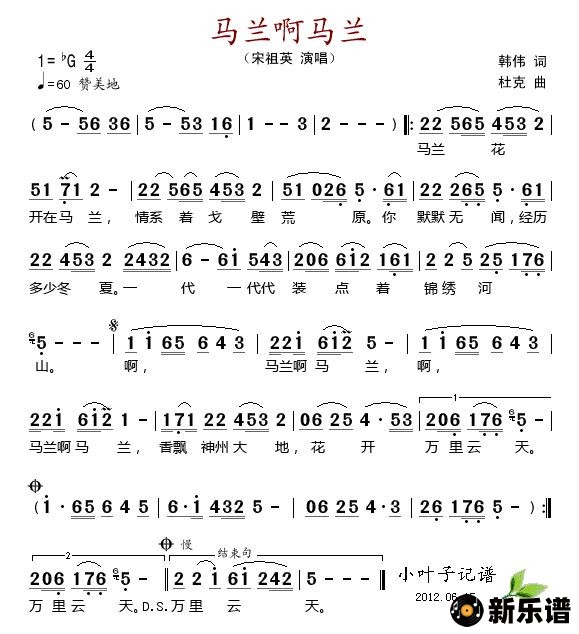 《马兰啊马兰》简谱 宋祖英-小叶子制谱